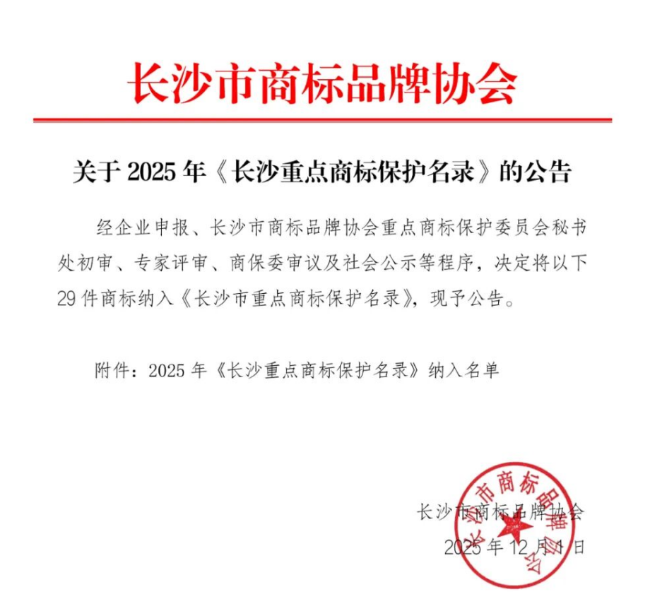 12月1日,长沙市商标品牌协会公布了2025年《长沙重点商标保护名录》,拥有 375 年历史的“中华老字号”平博pinnacle平台凭借深厚的品牌底蕴、突出的市场影响力及完善的商标保护体系,成功入选该名录。